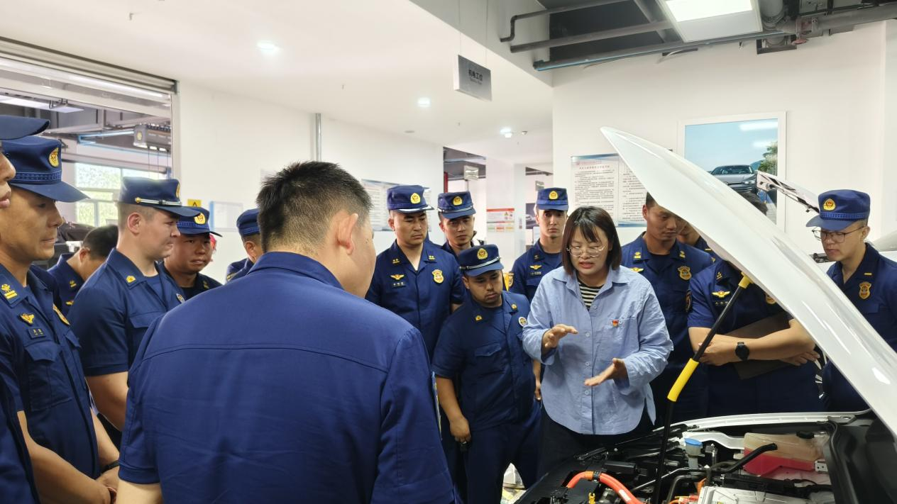 双带头人党支部书记崔丹丹针对将新能源汽车的“三电系统”与传统燃油车的“发动机+油路”结构差异进行展示,结合新能源汽车火灾“隐蔽性强、蔓延快、复燃风险高”三大特点,讲解“安全防护、高压系统断电”等新能源汽车火灾救援关键要点,帮助消防救援队员掌握新能源汽车结构原理。