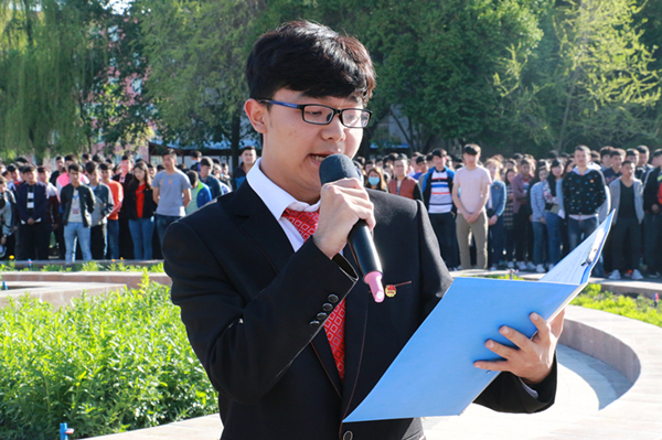 最后团员代表张泽轩进行了青年代表献词,他表示,青年人应当铭记五四精神,牢记习近平总书记的殷切期望和深情嘱托,自觉肩负起维护新疆社会稳定和长治久安的青春责任,热爱中国共产党、热爱祖国、热爱中华民族大家庭,与全疆各族人民一道,以扎实的作风、有力的行动和优异的成绩迎接党的十九大胜利召开!