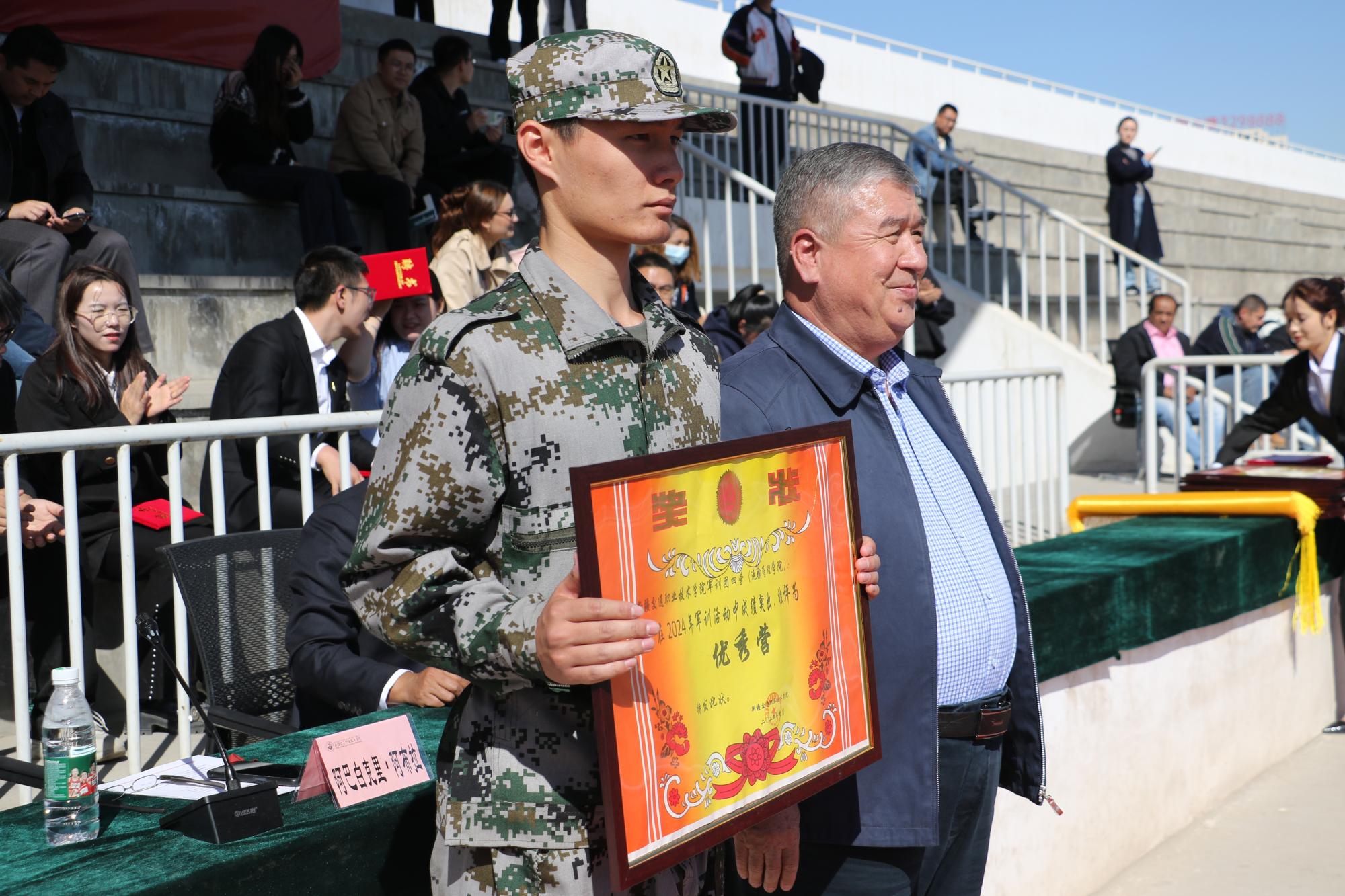 在总结会上,学院向武警新疆总队乌鲁木齐支队赠送了锦旗,并向军训优秀营、优秀连队、优秀教官代表、优秀标兵颁发荣誉证书。同时,学院为新聘任政治辅导员颁发聘书,并表彰了2023-2024学年“三好学生”“优秀班干部”。