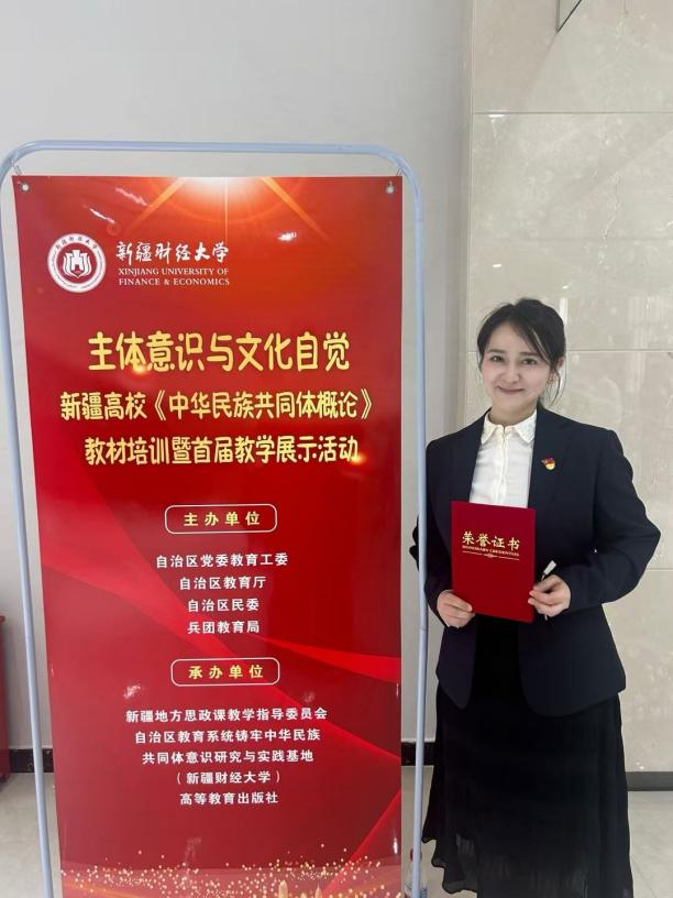 5月11日,由自治区党委教育工委、自治区教育厅、自治区民委、兵团教育局主办的新疆高校首届《中华民族共同体概论》课程教学展示活动在新疆财经大学举行。来自全疆高校的60名优秀教师聚焦国家统编教材,展开了一场高水平的现场教学竞技,最终评选出普通高校组一等奖2名、高职院校组一等奖2名。学院马克思主义学院教师赛尤拉·肖开提代表学院参赛,以优异表现斩获高职院校组一等奖,彰显了学院思政教学的卓越实力。