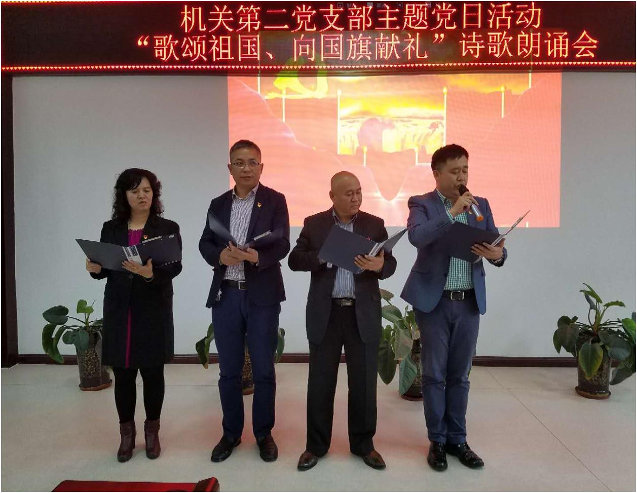 本次活动首先由支部书记带领全体教职工向国旗敬礼,全体党员面对党旗庄严宣誓,重温入党誓词。在活动中,机关第二党支部第一党小组朗诵了《为你祝福 我的祖国》,第二党小组朗诵了《为了明天》,第三党小组朗诵了《祖国,我的母亲》。