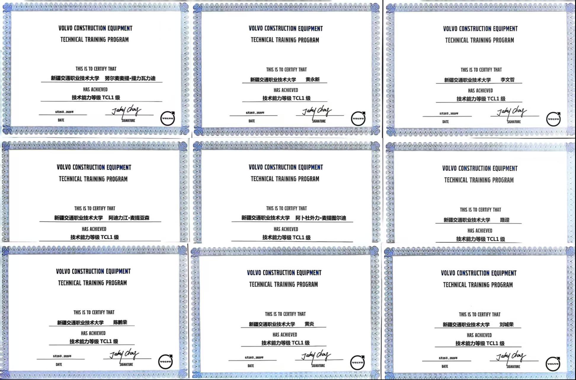 今日获悉,机电工程学院智能工程机械运用技术专业学生在沃尔沃TCL1级认证考试中取得优异成绩!5月26日,机电工程学院智能工程机械运用技术专业77名学生参与了由校企合作企业沃尔沃建筑设备投资(中国)有限公司开展的全国校企合作院校TCL1级认证考试。77人中有26人顺利获得证书,获证率较往年显著提升。其中,筑机D231班努尔麦麦提·提力瓦力迪位居第五名,阿迪力江·麦提亚森位居第七名,两位同学表现尤为突出,以优异成绩跻身全国前十名,展现了KY开元学子扎实的专业技能与强劲的竞争力!