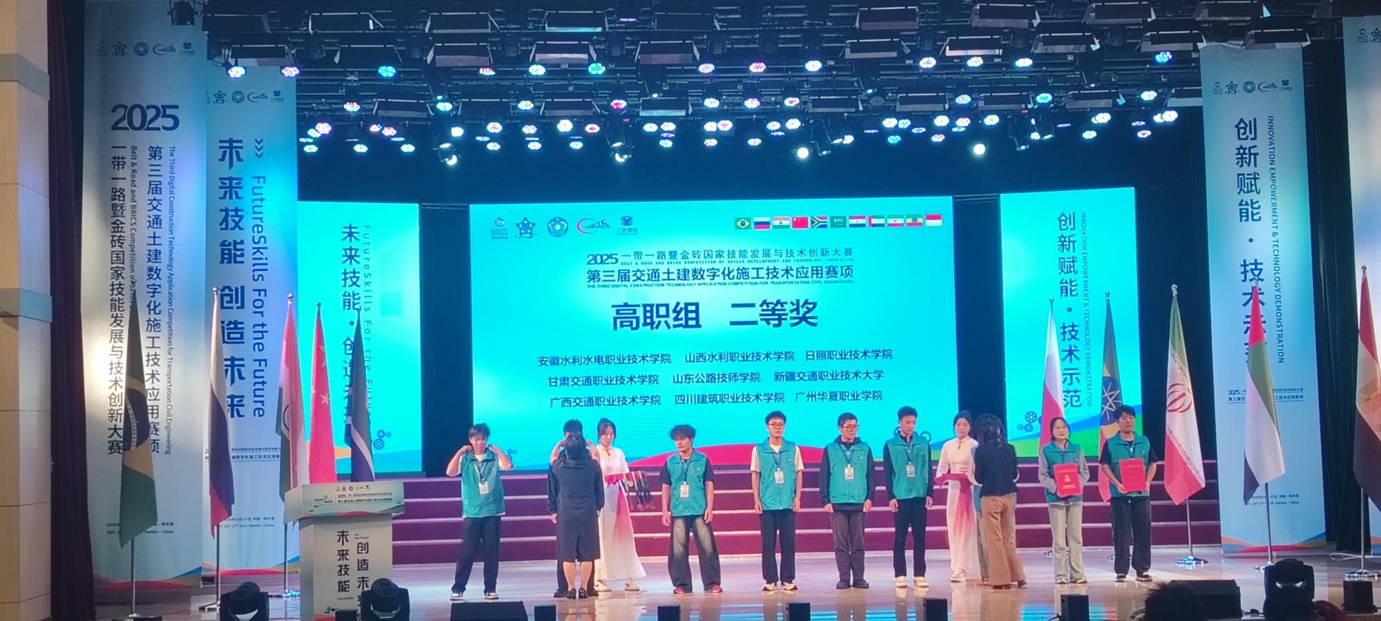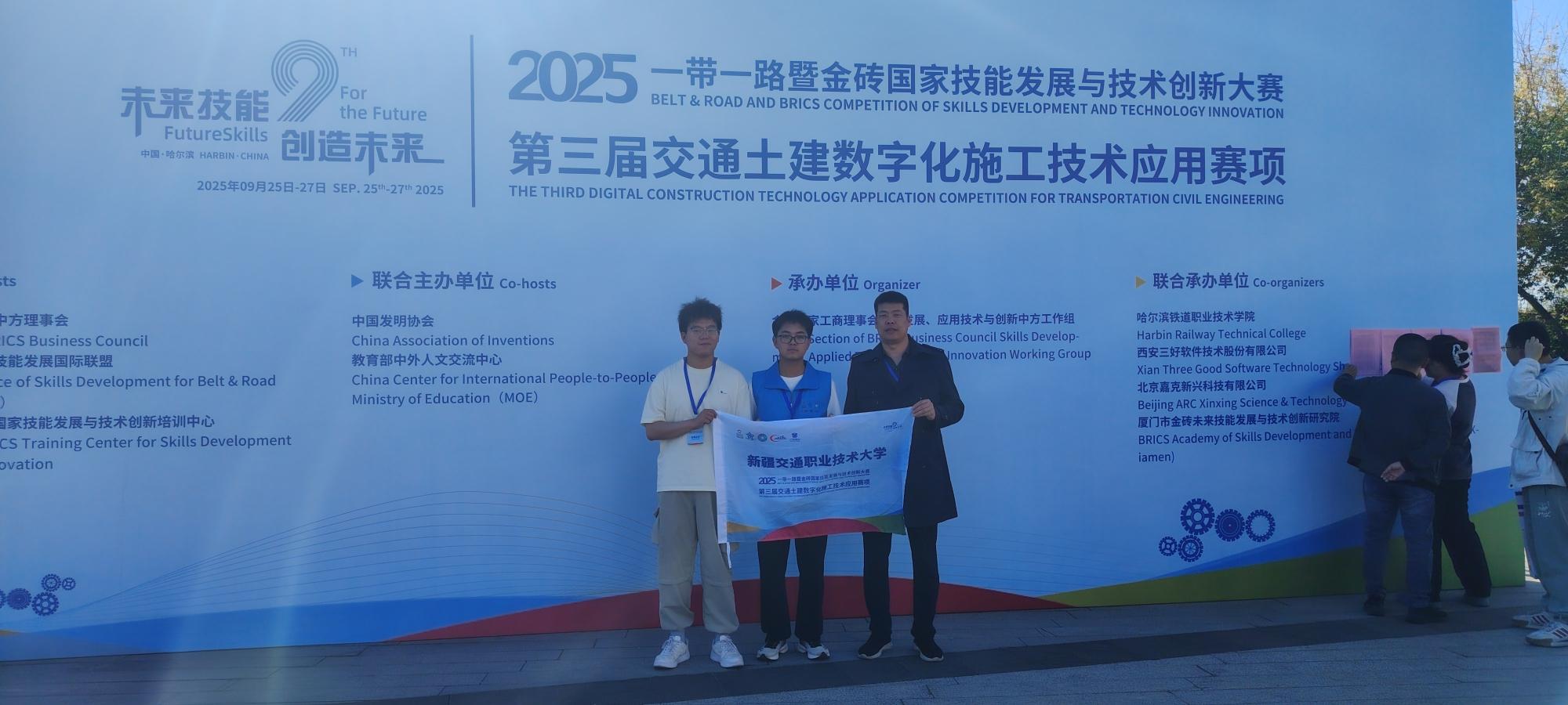 9月25日-27日,2025“一带一路”暨金砖国家技能大赛第三届交通土建数字化施工技术应用竞赛全国总决赛在哈尔滨铁道职业技术学院成功举办。道路桥梁工程学院道桥D232班赵鸿榆、张国强团队凭借出色的综合能力与稳定的临场发挥在强手如林的竞争中脱颖而出,荣获大赛高职组二等奖。