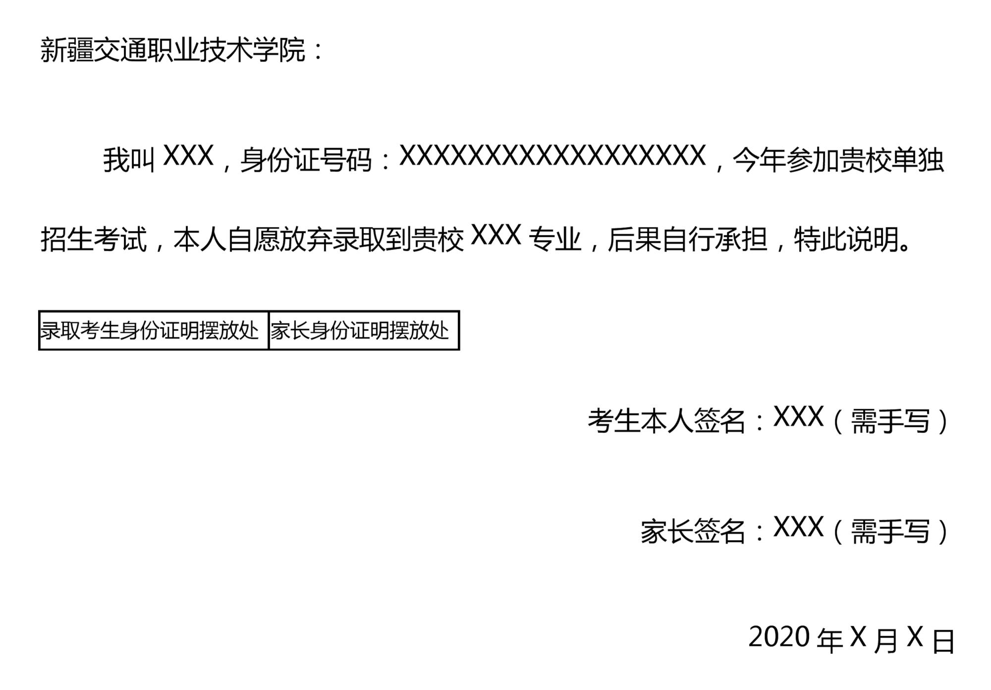 现将我院2020年单招拟录取名单予以公示,公示时间为5月16日——5月22日,公示期间,考生可向KY开元申请自愿放弃录取,并提交相关材料,格式如下。公示期满无异议者视为确认录取,KY开元将上报拟录取数据到自治区招生办审批并办理录取手续。